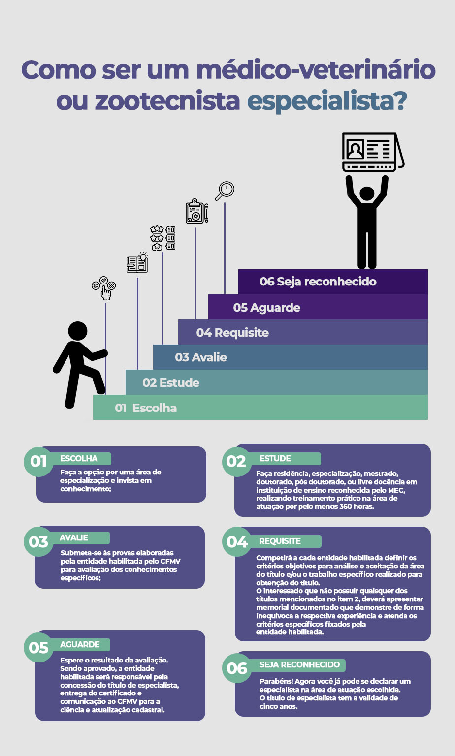 Para obter esse título, o profissional precisa ser aprovado em avaliação aplicada por uma das entidades habilitadas. Essas entidades também são responsáveis por emitir o certificado de especialista e enviar ao CFMV a lista de aprovados, para registro e atualização cadastral.